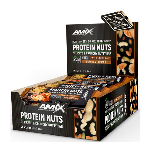 Protein Nuts Bar da Amix Nutrition. Barra de proteínas com mais de 21% de proteína, fácil de transportar e levar para qualquer lugar!
