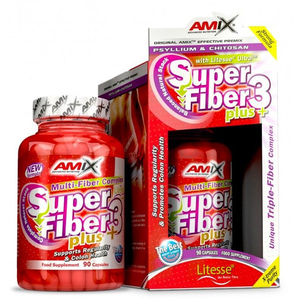 Super Fiber3 Plus de Amix Contém fibra probiótica, que estimula a proliferação de bactérias no cólon, produzindo efeitos positivos. Quitosana, fibra natural à base de quitina, que ajuda a eliminar todo o excesso de gordura e melhora os níveis de colesterol no organismo. Também contém Psillium, que amolece as fezes, protege o revestimento do estômago, alivia a constipação e reduz o acúmulo de toxinas. Estes combinados são um trio perfeito que irá ajudá-lo a alcançar uma boa saúde intestinal. O intestino deve receber a manutenção que merece e precisa, para que possa funcionar corretamente. É necessário mantê-lo saudável para cumprir as suas funções, sem que os alimentos nos prejudiquem e sem que eles se acumulem.